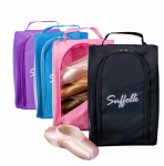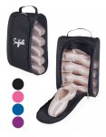 Nylon and mesh shoe bag with handle and zip front. Perfect storage for allowing shoes to dry completely. Holds 5 pairs of pointe shoes or multiple pairs of other dance shoes at 8.5 inches wide, 13 inches tall, and 5 inches deep.